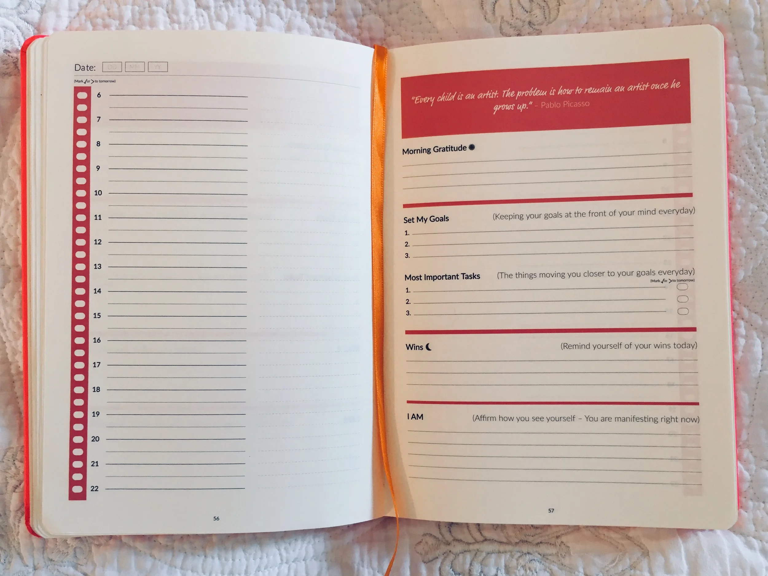 There are many sections to it, including pages to help you review your week which is really effective. My favourites are the daily pages that start with a motivational quote.