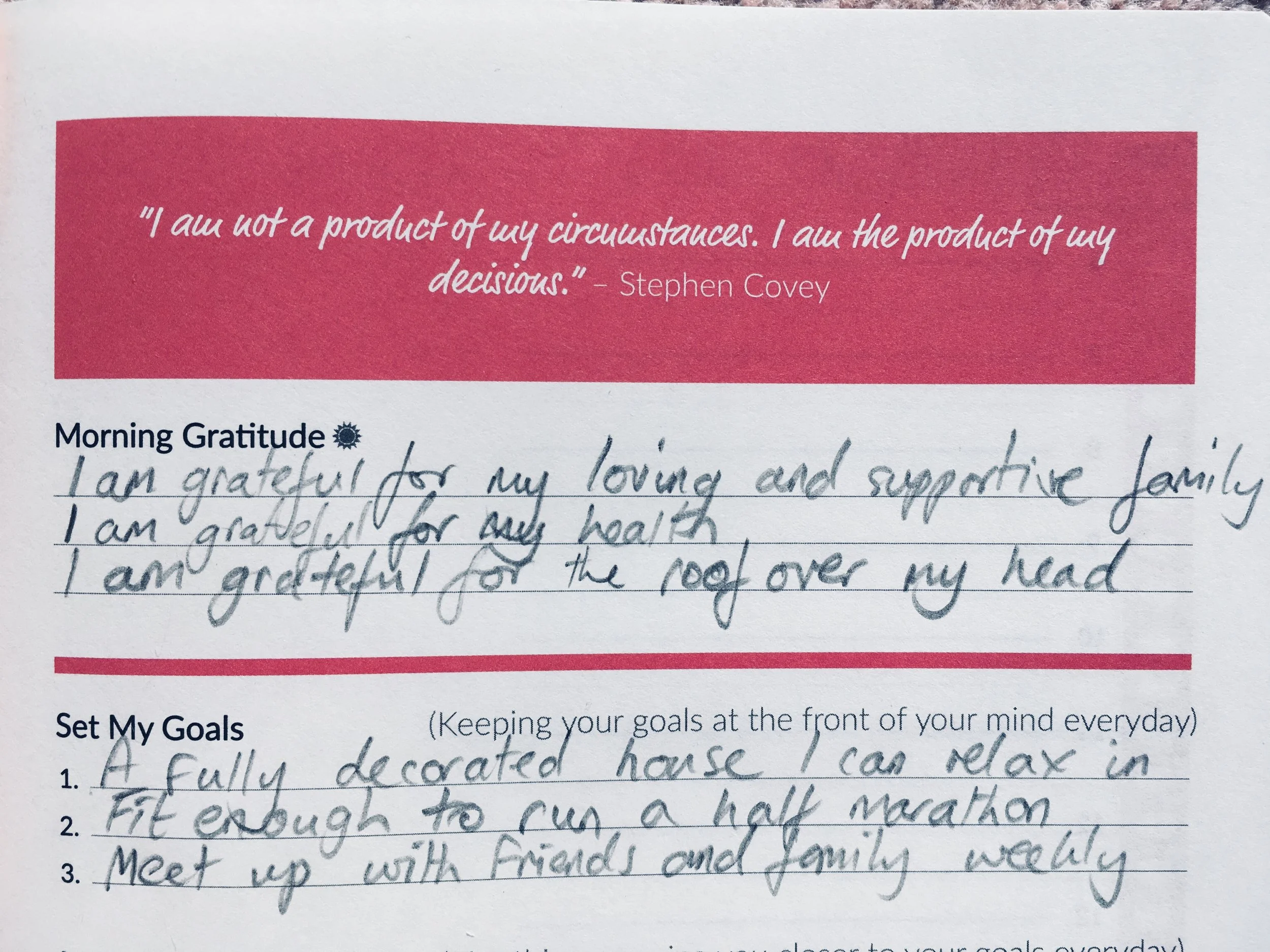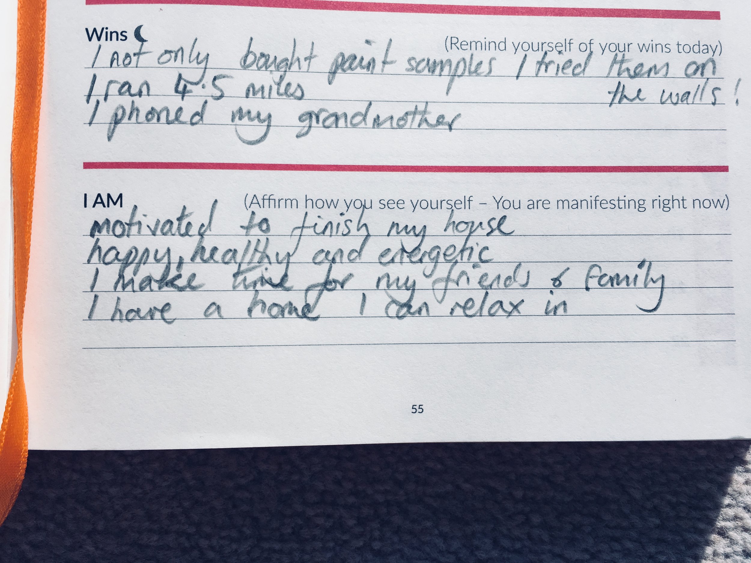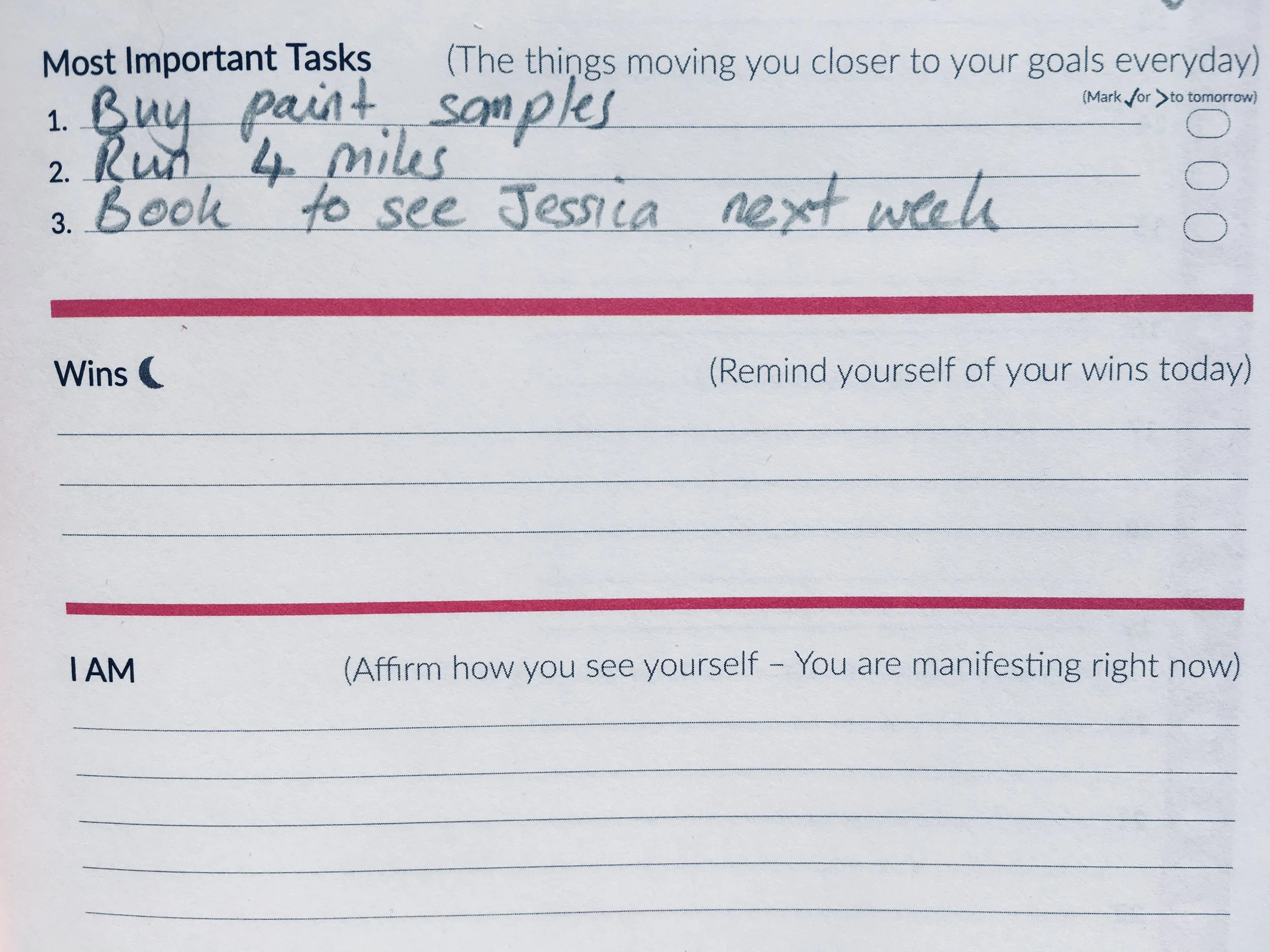 Really imperative is that it also asks you to consider what you are grateful for every morning. This may not seem of substance, but no matter how motivated, focussed and energetic you are, if you don’t value the journey and what you have right now you will never appreciate the goals you achieve anyway.So this bit is all about stopping and smelling the roses so you know that your efforts are all worthwhile.If you're doing up your house remind yourself that you're grateful for the roof over your head, or for the family in it, and/or the pets that give you joy every day (even if they do scratch or chew the furniture!).