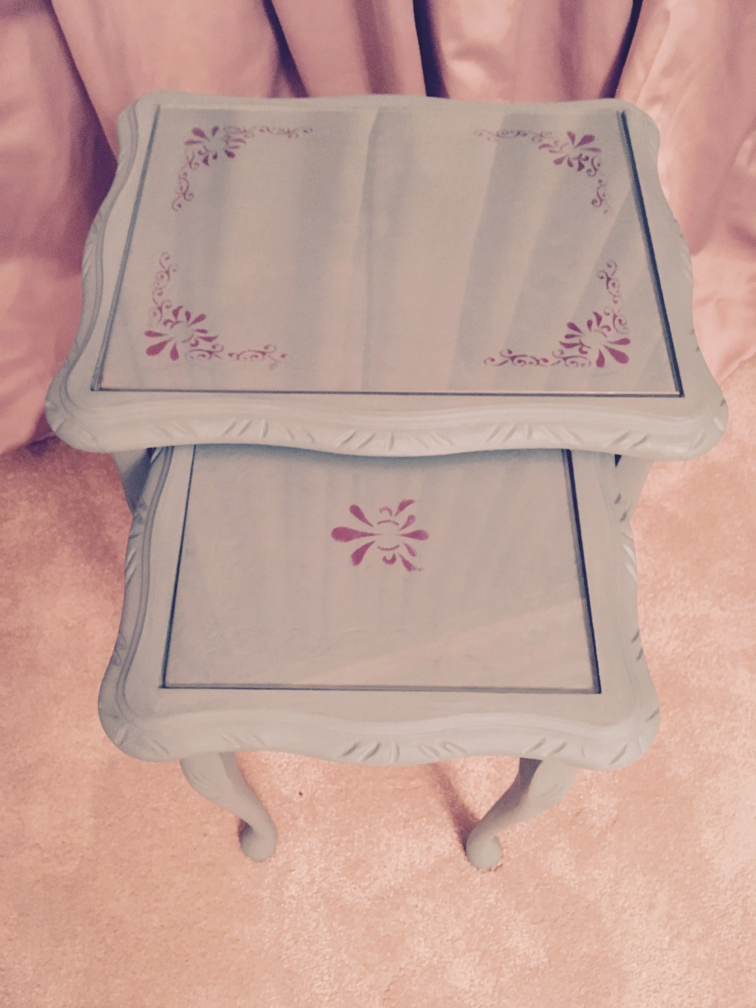 I used the milk paint for the darker grey on the top of these tables.
