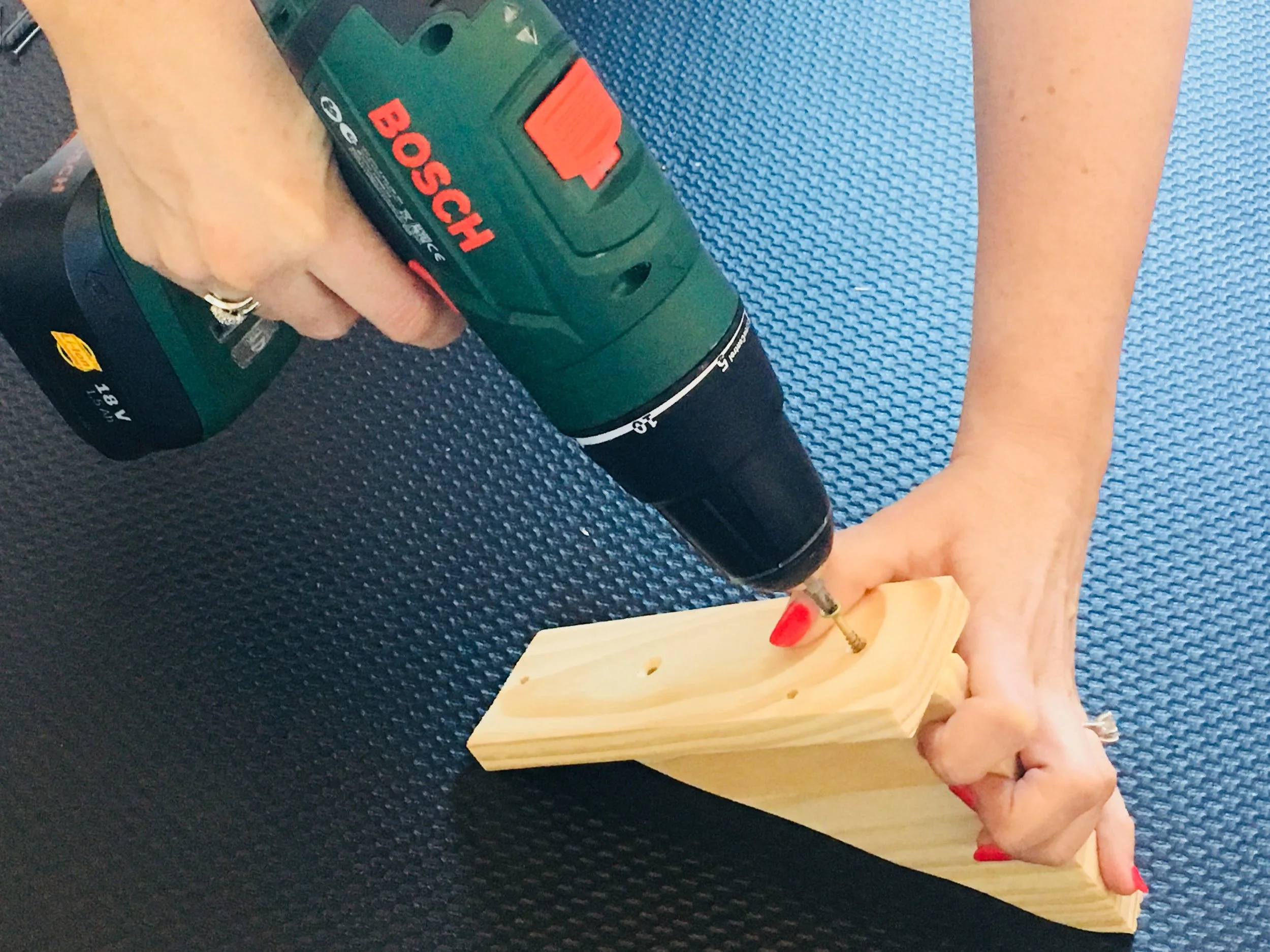 If the wall plates don’t have ready-made holes, drill three for eventually securing to the wall. You will need two screws at the top and one at the bottom of each wall plate.
