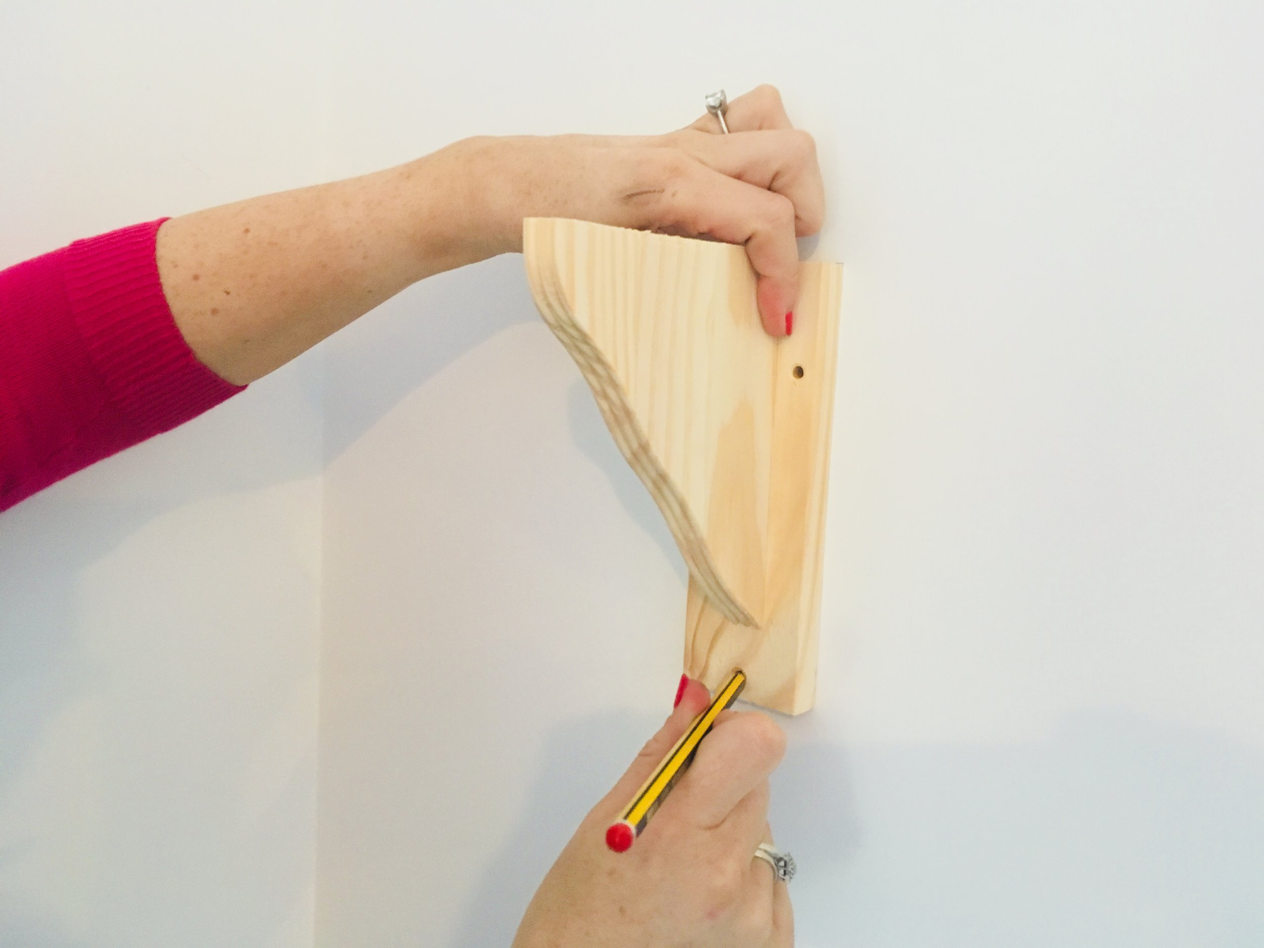 Hold the brackets in position (for a standard small shelf this will be about 400mm apart, or 50mm in from each end). Draw through the previously made holes using a spirit level to make sure the shelf will be level.