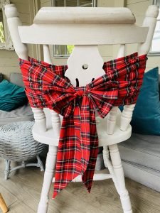 Now for the chairs. Take some festive ribbon or fabric and tie to the backs of the chairs.